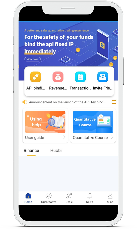Simple and easy to operate, users only need to bind the Huobi and Binance Exchange APIs, select the corresponding currency, the corresponding strategy style, and one-click start, and then they can realize intelligent fool-style quantitative financial management